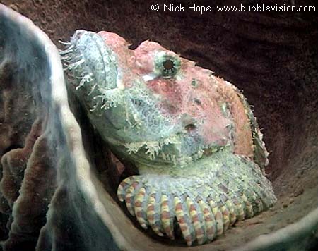 This tassled scorpionfish (Scorpaenopsis oxycephala) was sitting motionless in a basket sponge. See more of it in my Anemone Reef short movie.