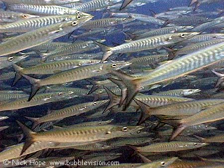 Chevron barracuda (Sphyraena putnamae) are often found in dense schools such as this at Burma's Fan Forest Pinnacle.
