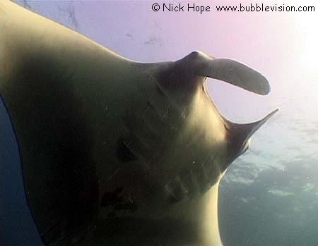 A giant manta ray (Manta birostris) cruises overhead at Burma's Fan Forest Pinnacle.