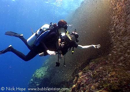 Playing with the great clouds of black-nosed cardinalfish (Rhabdamia cypselurus, or "glassfish") at Black Rock is a great way to pass the safety stop.