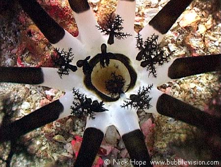 While ascending from the depths at Black Rock, I was fascinated to watch a pair of these burrowing sea cucumbers (Massinium magnum) feeding by passing waterborne nutrients into the mouth at the centre.