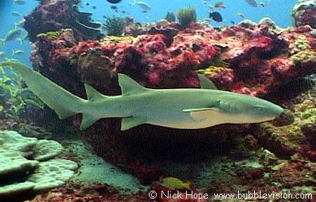 One of many tawny nurse sharks (Nebrius ferrugineus) to be found at Nurse Reef in the Burma Banks. This one is pregnant.