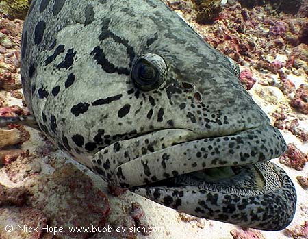 Freddy the potato grouper (Epinephelus tukula) at Silvertip Bank shows off several rows of small but razor sharp teeth.
