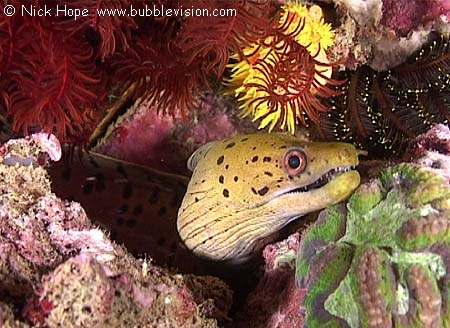 A fimbriated moray eel (Gymnothorax fimbriatus) surrounded by feather stars at Cavern Island.