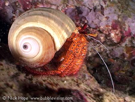 At Pinnacle Arch in Burma we were impressed by this white-spotted hermit crab's (Dardanus megistos) choice of empty snail shell as its home. Later this crab may have to find a larger shell as it grows.