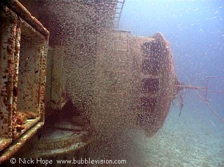 Looking aft towards the bridge. The Tuna Wreck is already shrouded in cardinalfish (Rhabdamia cypselurus).
