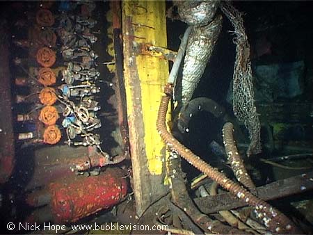 The engine room of the Tuna Wreck is open and contains hanging cables and hoses.