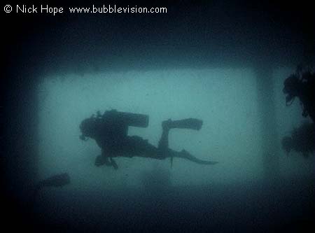Scuba diver swimming through the car deck of the King Cruiser shipwreck.