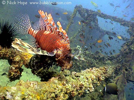 Common lionfish (Pterois volitans) on the King Cruiser. The superstructure, seen in the background, is decaying fast.