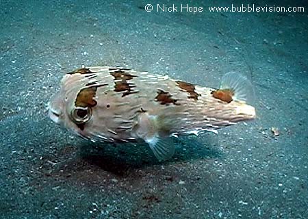 This long-spine porcupinefish (Diodon holocanthus) or "balloonfish" on the seabed next to the King Cruiser was missing its tail, but still able to swim around very fast.
