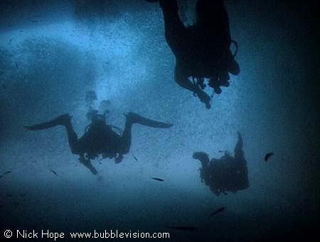 Dominik and the 2 Michaels head out from the darkness of the void between King Cruiser's twin hulls. The enormous stern car door has since crashed to the seabed, blocking out nearly all the light you can see on this picture.