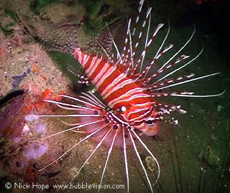 The spotfin lionfish (Pterois antennata) often hangs under ledges during the day but comes out at night to feed on small fish, shrimps and crabs.