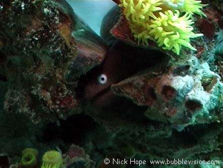 This greyface moray (Gymnothorax thyrsoideus) was entwined with it's partner and peered out at us from its zig-zag oyster (Lopha folium) home.
