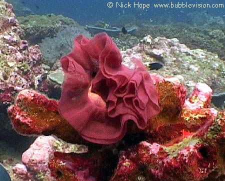 Although this may look like a lost hair-band caught on the coral, it is actually the egg mass of a Spanish dancer nudibranch (Hexabranchus sanguineus).