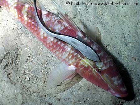 By night at Phi Phi Leh, a sharksucker (Echeneis naucrates) has found a sleeping dash-and-dot goatfish (Parupeneus barberinus) as its host.