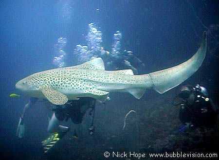 This leopard shark (Stegostoma fasciatum) at Bida Nok had rope around its tail but it would be very difficult to remove without upsetting the shark.