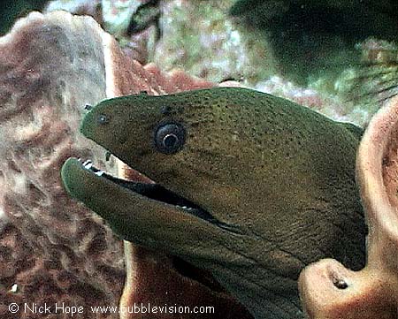 We found this giant moray (Gymnothorax javanicus) at Phi Phi Island sitting between 2 basket sponges.
