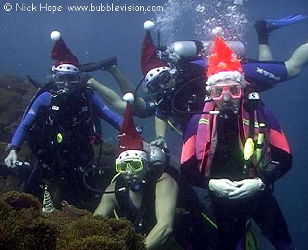 4 wet Santas celebrating Christmas Eve, 2001. (I'd like to blame the nitrogen narcosis, but we were only in 10m!). Note waterproof Christmas tree, bottom left.