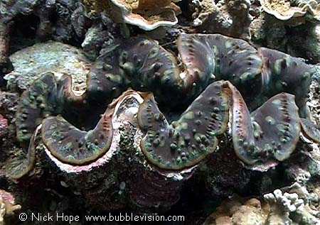 The mantle of this fluted giant clam (Tridacna squamosa) is exposed to collect sunlight for symbiotic algae.