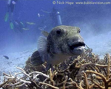 The starry puffer (Arothron stellatus) rarely allow divers to approach from the front, but this old fish is obviously used to divers.