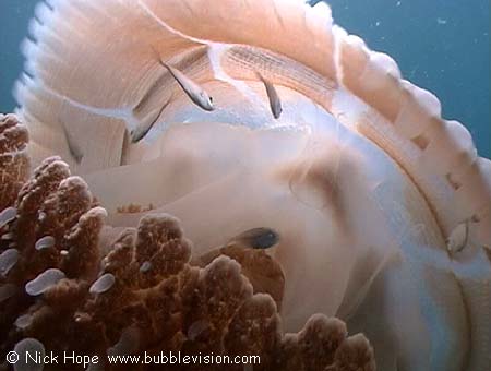 Jellyfish Versuriga anadyomene at Racha Yai with "hitchhiker" fish sheltering under its bell.
