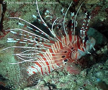 We found this spotfin lionfish (Pterois antennata) under the coral. At night it will come out to feed on small fishes, shrimps and crabs.