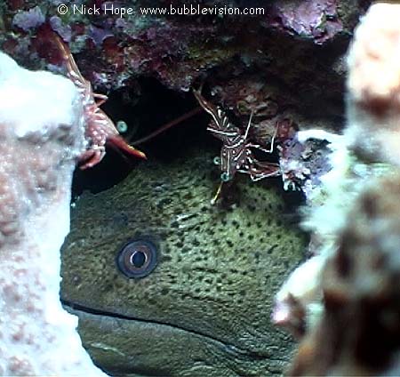 Durban dancing shrimps (Rhynchocinetes durbanensis) are often found in the same dark gaps in the coral favoured by the giant moray (Gymnothorax javanicus).