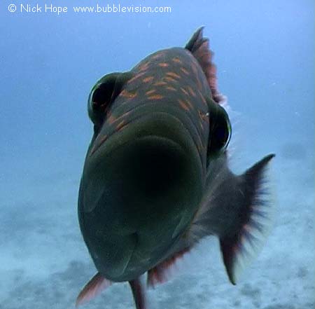 This cheeklined wrasse (Oxycheilinus digramma) hounded us for ages for cleaning purposes, but was overcome by vanity when it spotted its reflection in my lens.