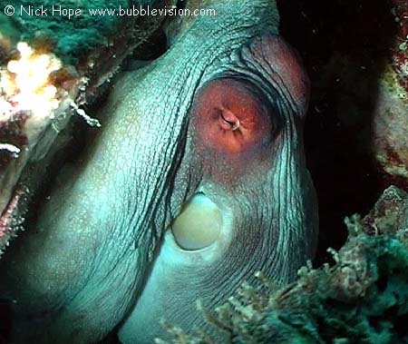 Big blue octopus (Octopus cyanea) can sometimes be spotted at Racha Yai. This octopus retreated into its hole and changed colour to try and match its surroundings.