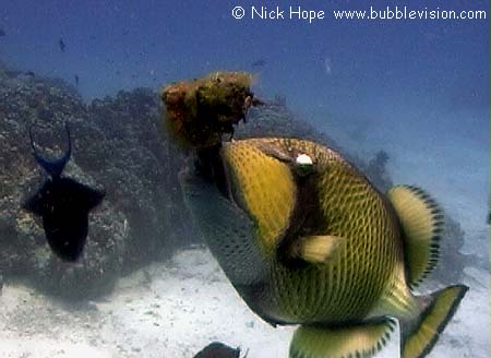 Triggerfish usually feed on the seabed, but we found this titan triggerfish (Balistoides viridescens) eating from a piece of floating marine growth.