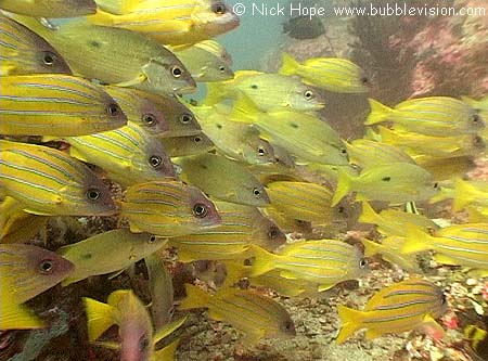 Schools of five-lined snappers (Lutjanus quinquelineatus) are common at Richelieu Rock. Here they are joined by similarly coloured dory snappers (Lutjanus fulviflamma).