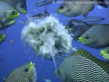 Java rabbitfish (Siganus javus) eating a jellyfish at Richelieu Rock. Moments later the remains of the jellyfish fell to the seabed.