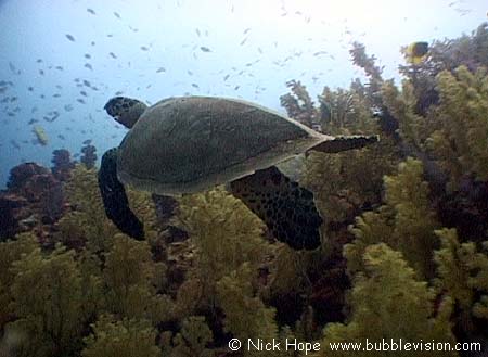 Pacific hawksbill turtle (Eretmochelys imbricata bissa) swimming over the soft corals at Richelieu Rock.