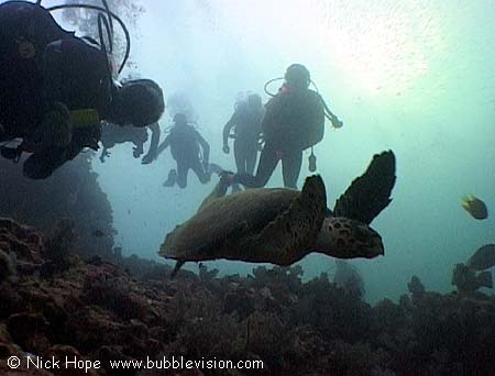 Pacific hawksbill turtle (Eretmochelys imbricata bissa) takes flight from onlookers at Richelieu Rock.