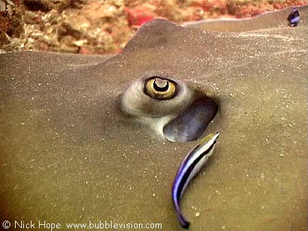 Ar Shark Cave a Jenkins' whipray (Himantura jenkinsi) lies patiently, allowing a bluestreak cleaner wrasse (Labroides dimidiatus) to remove small parasites from its skin.