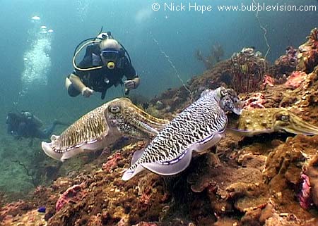 During their mating season, pharaoh cuttlefish (Sepia pharaonis) are engrossed in courtship and are easily approached by divers.