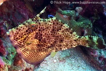 The variety of marine life at Shark Cave is enormous. This rare strap-weed filefish (Pseudomonacanthus macrurus) is just one example.