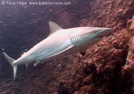 When there is no surge at Shark Cave, grey reef sharks (Carcharhinus amblyrhynchos) can often be found circling around the mouth of the canyon.