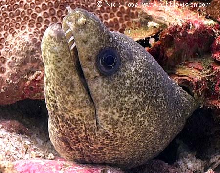 Yet another species of moray at Shark Cave, the peppered moray (Gymnothorax pictus) is a synchronous hermaphrodite, which means it is male and female at the same time.