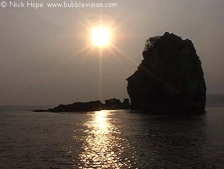 Late afternoon tranquility at Shark Cave belies the underwater activity that makes this in many people's opinion the Andaman Sea's best dive site. The site is also known as "In through the out door" and "Three Stooges".