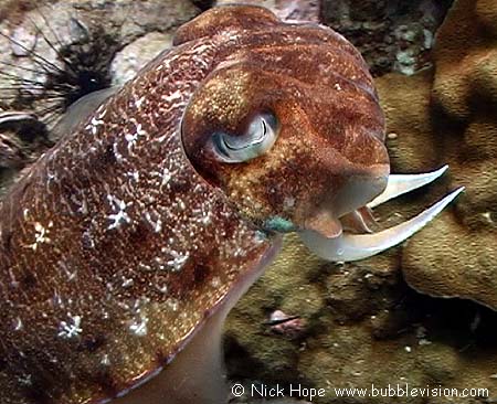 Pharaoh cuttlefish (Sepia pharaonis) are very intelligent creatures and their ability to change colour is astonishing. I found this one watching its female mate depositing her fertilised eggs in the reef.