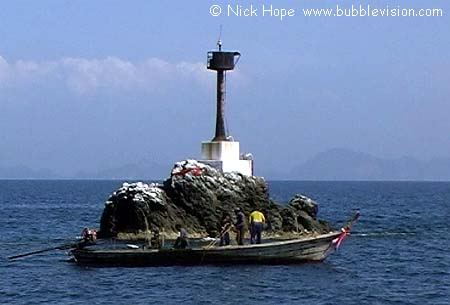 Hin Mu Sang, known by the dive community as "Shark Point". Divers from the fishing boat were illegally taking oysters.