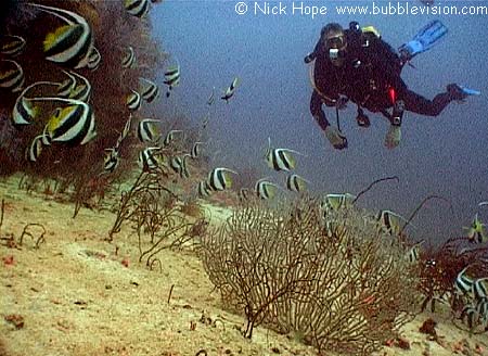 The absence of exhaust bubbles from Rob Royle's fully-closed rebreather allows him to get close to fish such as these schooling bannerfish (Heniochus diphreutes) at East of Eden.