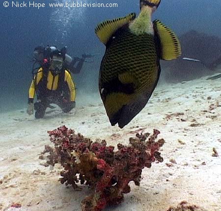 The highly territorial titan triggerfish (Balistoides viridescens) has extremely powerful jaws and turned this coral over and over in search of food.