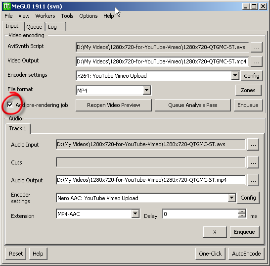 You can force MeGUI to write the output of your AviSynth script to a lossless avi file (with the Huffyuv codec) before compressing with x264, rather than reading the frameserved output of the script as it goes along. This can allow QTGMC and x264 to use more threads and memory because they are not competing for your system's resources. I found this slightly slower with everything in single-threaded 32-bit mode, but if you're multi-threading then it might be faster. You will need plenty of disk space. I found that 1 minute of 1280x720 requires approximately 1.1 GB. To do this, check the Add pre-rendering job box on the Input window.