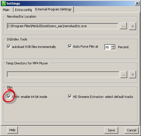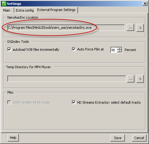Next we need to tell MeGUI where the Nero AAC encoder executable file is located. In MeGUI choose Options > Settings > External Program Settings and navigate to C:\Program Files\MeGUI\tools\nero_aac\ (where you just put the file) then save.