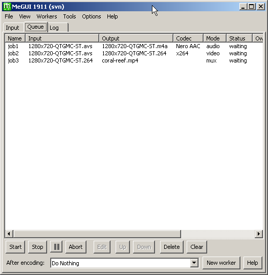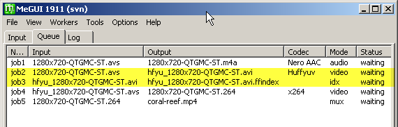 You will see 2 extra jobs in your queue. Firstly the Huffyuv file and secondly an index of that file for use by the subsequent x264 encoding job. The Huffuyv avi file will be written to the same folder as your avs script and will be deleted after completion of the jobs. A short AviSynth script called, for example, hfyu_1280x720-QTGMC-ST.avs will be left behind, and you can delete it.