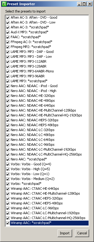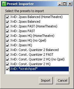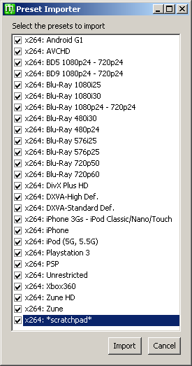 Now go back to the Preset Importer window and choose whichever presets you wish and click Import. I normally take them all for reference and possible future use, but you don't need any for the purposes of this tutorial. It doesn't matter whether you overwrite or skip the *scratchpad* presets when prompted. If no x264 presets are offered then, after the other presets have been imported, download the latest x264 presets from this thread at the doom9.org forum and import them using File > Import Presets.