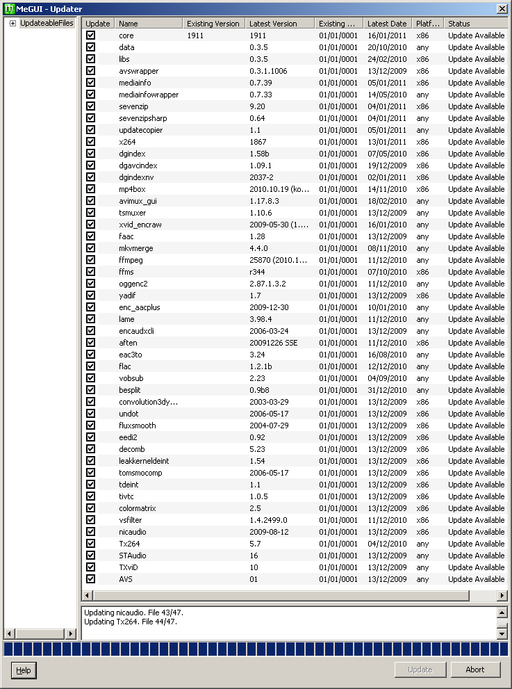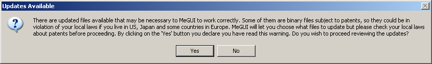 Click Yes to review the available updates. The first time you run MeGUI, most of these are not really updates at all, but the files such as the x264 encoder that MeGUI requires in order to work. They are installed in the MeGUI folder and I have never found any conflicts between these files and versions of the same files you might have installed elsewhere on your system. Select all and click Update.