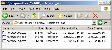Note that the download from Nero is called NeroAACCodec-1.5.1.zip but actually contains version 1.5.4 (I guess someone forgot to rename it). Make a new folder called C:\Program Files\MeGUI\tools\nero_aac\ and unzip the three files inside the win32 folder to it. At the time of writing I'm using version 1.5.4 of the codec.